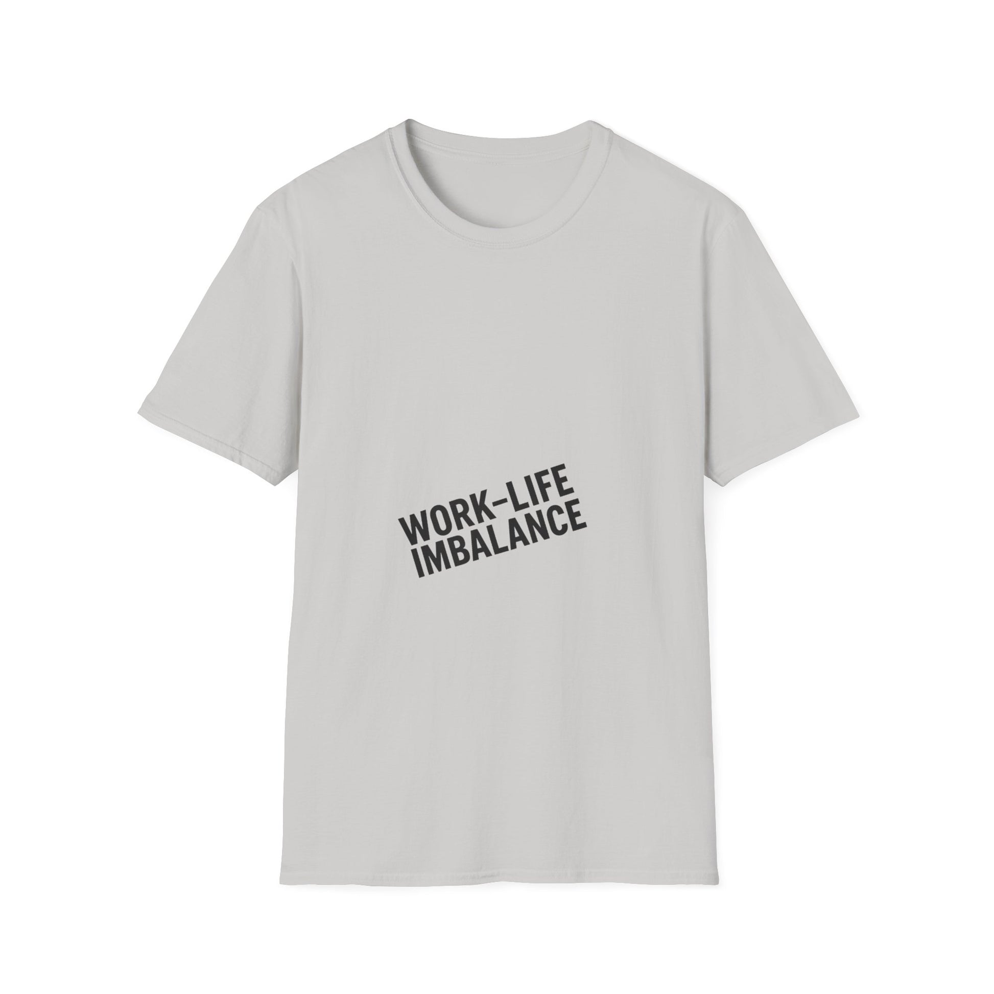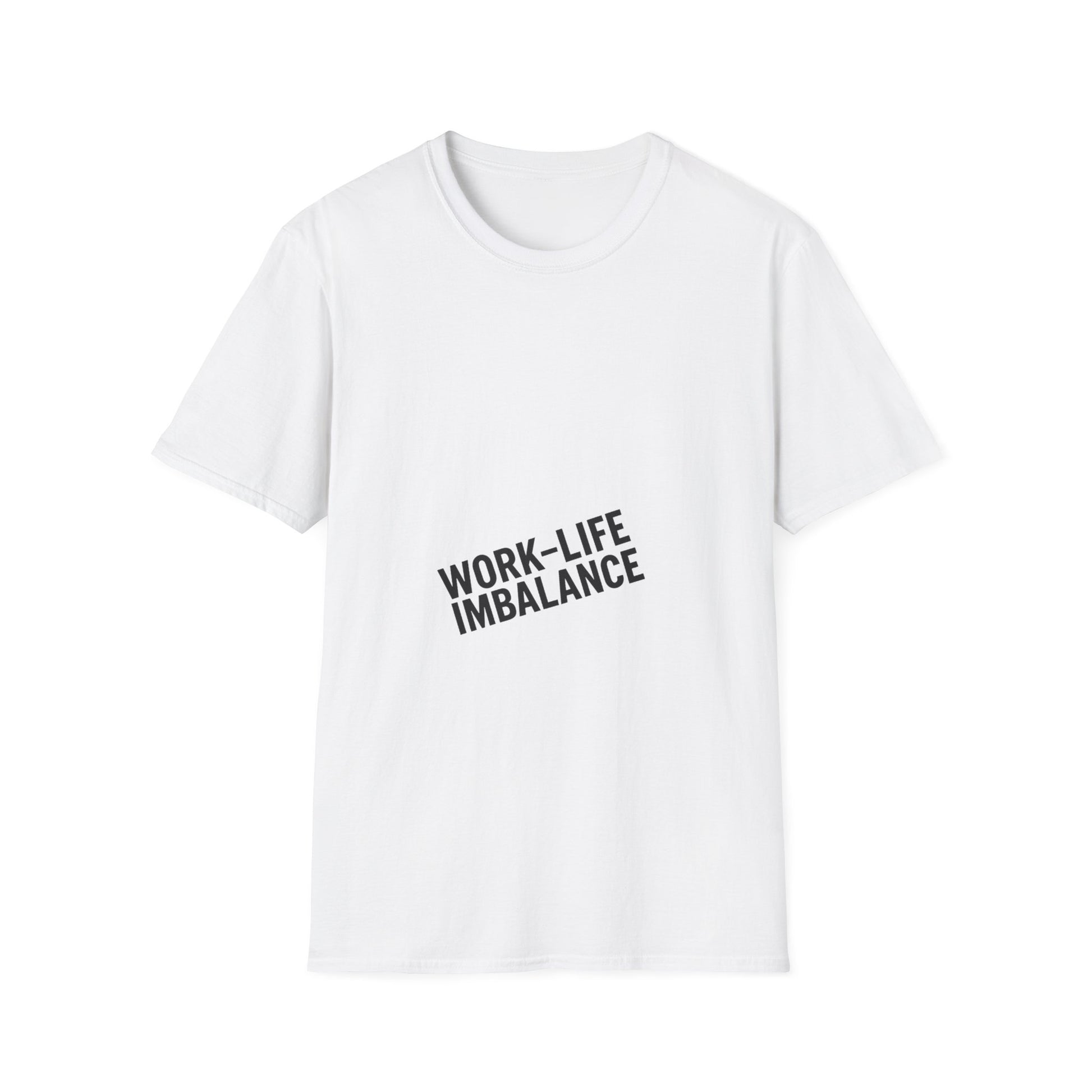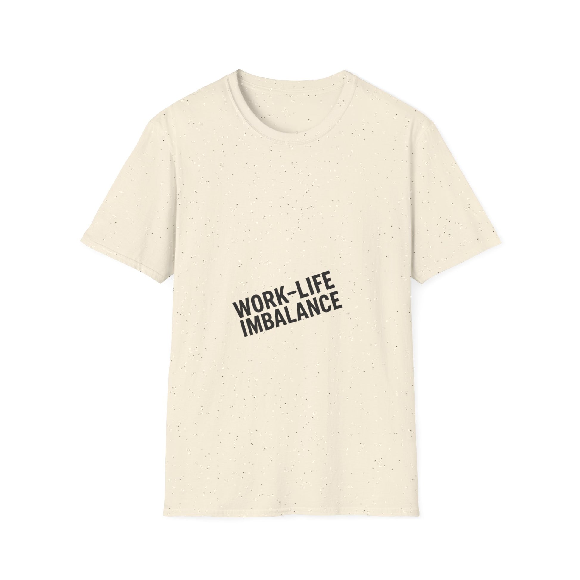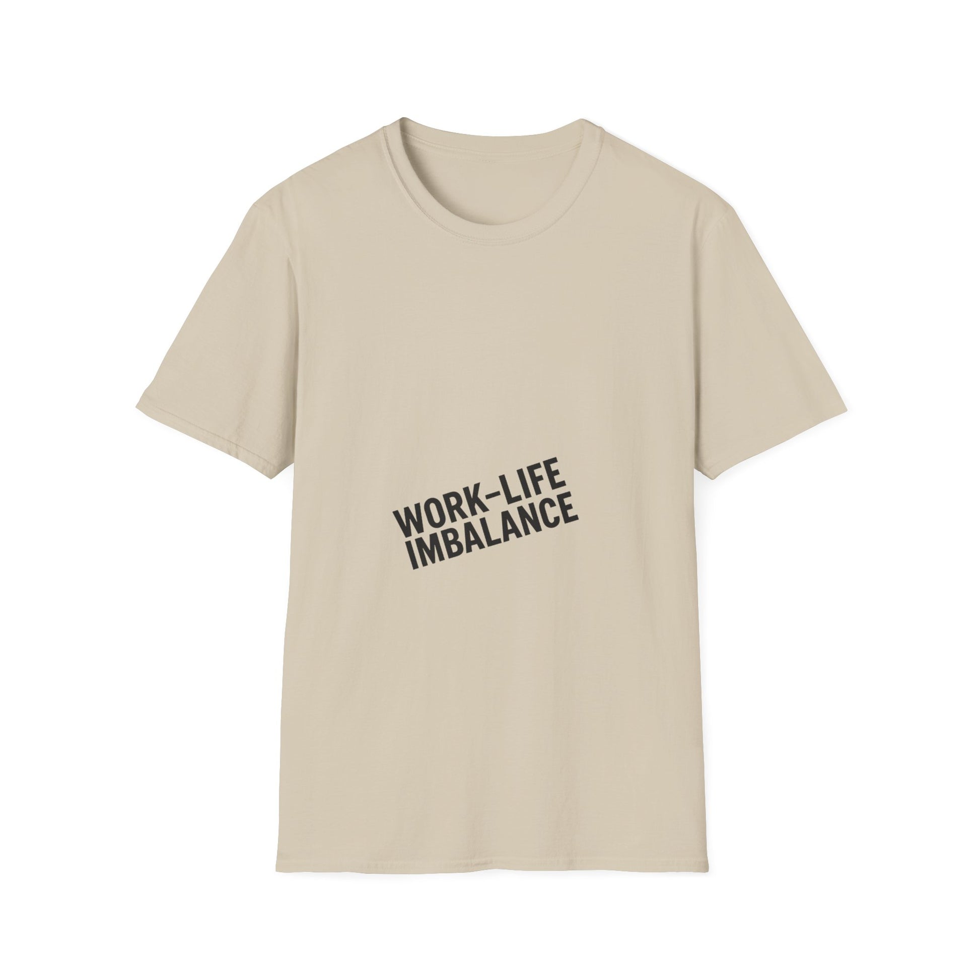 "Minimal centered slogan 'Work-Life Imbalance' in bold uppercase black text on cream background, slightly tilted letters to look unbalanced"